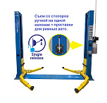 г/п. - 4 т. Для подъема легковых автомобилей всех моделей и марок при их техническом обслуживании и ремонте. Максимальное расстояние между подхватами: 2550 мм. Высота подъема лап (с подхватами): 1800 (1990) мм Длина задних лап: 780-1200 мм. Длина передних лап: 780-1200 мм. Толщина металла в стойках - 5,2 мм, толщина тросов синхронизации - 9 мм. Вес: 630 кг.