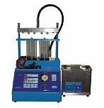 Стенд для проверки и промывки 6 инжекторов в ультразвуковой ванне. Автоматический слив тестирующей жидкости. Работает от сжатого воздуха. Имитация работы форсунок происходит с помощью встроенного электронного блока управления форсунками. В комплект поставки входит ультразвуковая ванна объемом 2,0 литра с подогревом и мощностью генератора 60 ВТ.