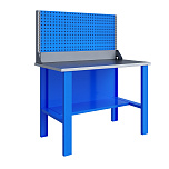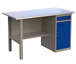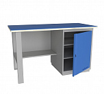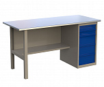 Однотумбовый. Допустимая нагрузка на столешницу 750 кг. Опорные элементы выполнены сварными из холоднокатаной стали. Верстак состоит из  опоры, тумбы P7 с дверью и двумя полками и полки-стенки. Все металлические элементы покрыты полиэфирной порошковой краской. Столешница состоит из фанеры марки ФСФ толщиной 24 мм, которая покрыта лаком-антисептиком и листом оцинкованной холоднокатаной стали толщиной 1,2 мм. Размеры (ВхШхГ) 855x1196x696 мм.