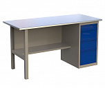 Стол бестумбовый поставляется в разобранном виде (4 места). Нагрузка на столешницу до 600 кг. Стандартный цвет: корпус - серый глянец RAL 7030, ящики и двери тумб - синий RAL 5017. Размеры: 855х1200х700мм. Вес: 40 кг.