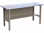 Верстак комплектуется полкой-стенкой, расположенной под столешницей для удобного размещения габаритного инструмента и оснастки. Опорные элементы выполнены сварными из холоднокатаной стали. Все металлические элементы покрыты полиэфирной порошковой краской. Столешница из фанеры толщиной 24 мм, которая покрыта листом оцинкованной стали толщиной 1,2 мм. Глубина столешниц 696 мм. Максимальная масса груза на столешнице - 350 кг.