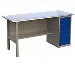 Верстак однотумбовый поставляется в разобранном виде. Нагрузка на столешницу до 600 кг. Стандартный цвет: корпус - серый глянец RAL 7030, ящики и двери тумб - синий RAL 5017. Размеры:855x1400x700 мм. Вес: 86 кг.