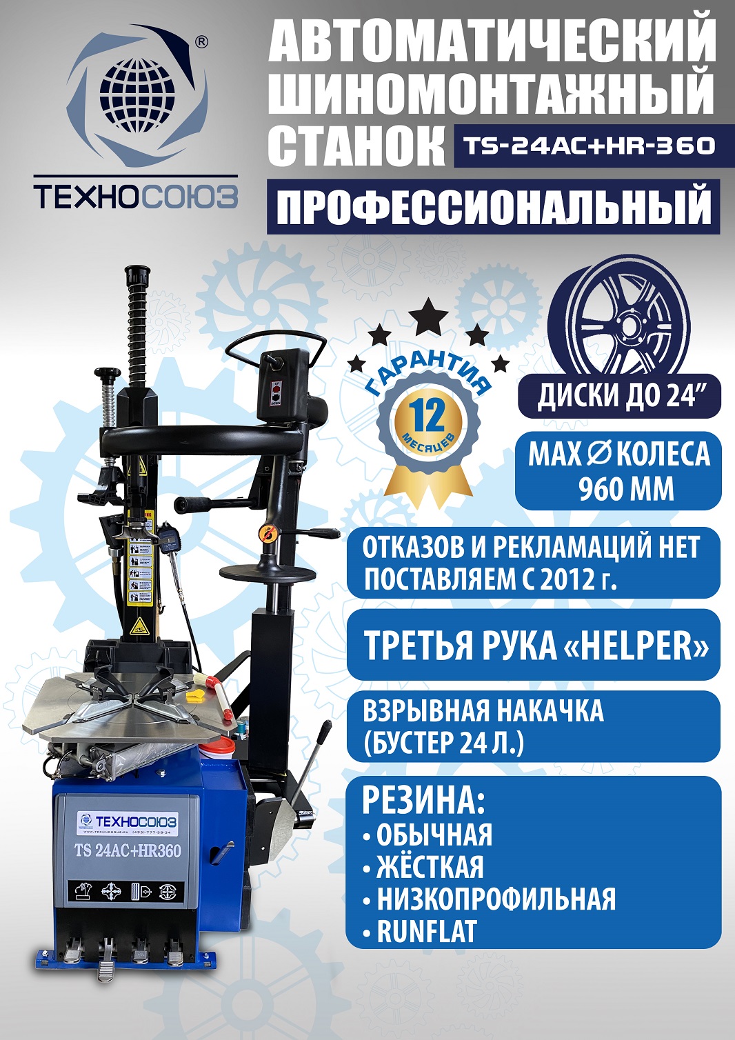 Автоматического шиномонтажного стенда TS-24AC+HR-360 Для дисков: внешний 10÷21”, внутренний 12÷24”. В комплекте взрывная подкачка + третья рука для работы с низкопрофильными шинами и RanFlat! Для колес легковых автомобилей, легких грузовиков, микроавтобусов и коммерческой техники. Напряжение 220/380В. Гарантия 18 мес. – наш монтаж, 12 мес. – самостоятельная установка.