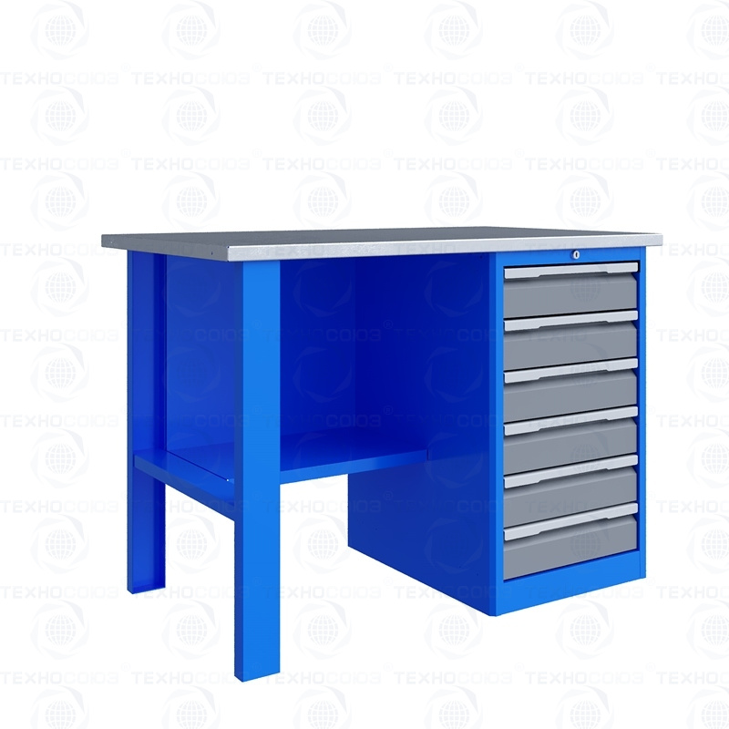 Тумба верстака - сварная. Ящики в тумбе устанавливаются на шариковых телескопических направляющих полного выдвижения. В тумбе P6 установлено шесть малых ящиков. Внутренние размеры малых ящиков (ВхШхГ), не более: 103 х 397 х 520 мм. Внутренние размеры больших ящиков (ВхШхГ), не более: 222 х 397 х 520 мм. Тумбы с ящиками снабжены общим центральным замком с поворотом ригеля 180 градусов и подпружиненной тягой. В комплекте два ключа.